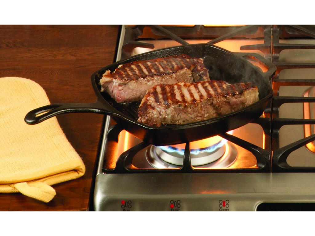 - Jeho největší výhodou je vysoká tepelná vodivost a akumulace tepla. Málokdy je potřeba zahřívat litinovou pánev na velmi vysokou teplotu.