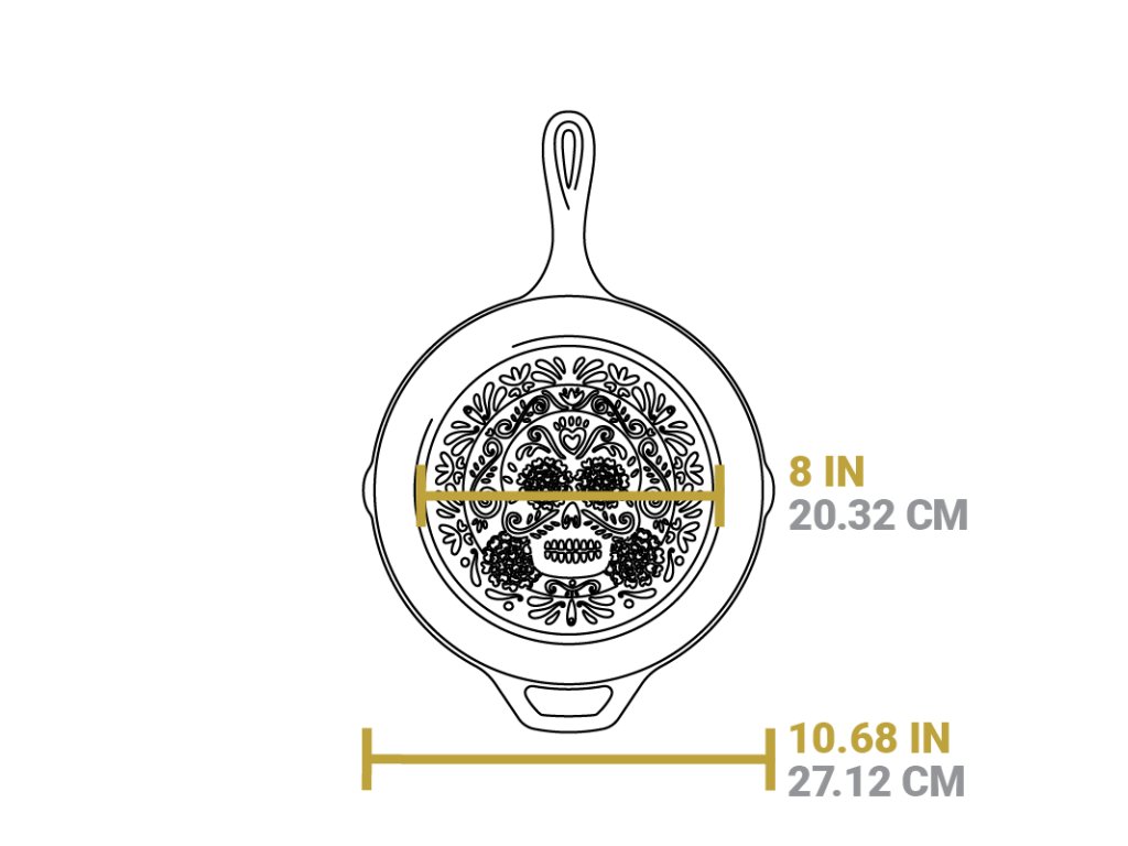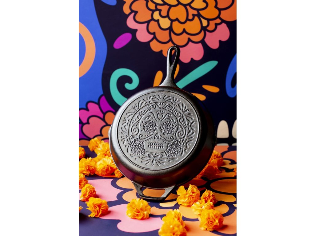 Tato litinová pánev Lodge 26 cm Sugar Skull s výrazným reliéfem lebky z mexické tradice Día de los Muertos je nejen stylovým doplňkem, ale také funkčním nádobím. Má vnější průměr dna 20 cm, vnější průměr u horního okraje 26 cm, výšku cca 5 cm a váží 2,4 kg. Vyrobená je v USA z litiny a s přírodním povrchem ze zapečeného sójového oleje, nabízí vynikající tepelnou vodivost a akumulaci. Maso připravíte i při zaplnění celé plochy bez tolik známého ochlazení slabých hliníkových pánví.
