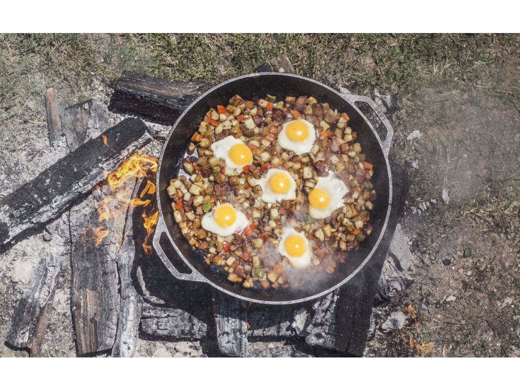 Díky dvěma madlům je manipulace bezpečná i při vysokých teplotách. Povrch s černou patinou je jen zapečený jedlý olej do povrchu nádobí - tato přírodní nepřilnavá vrstva se s používáním zlepšuje. Údržba je jednoduchá: ruční mytí, osušení, potření slabou vrstvou oleje a vytření do sucha. Pokud potřebujete rychle pohostit početnou skupinu, je tato litinová pánev Lodge 43 cm ideálním pomocníkem pro vaše vaření.