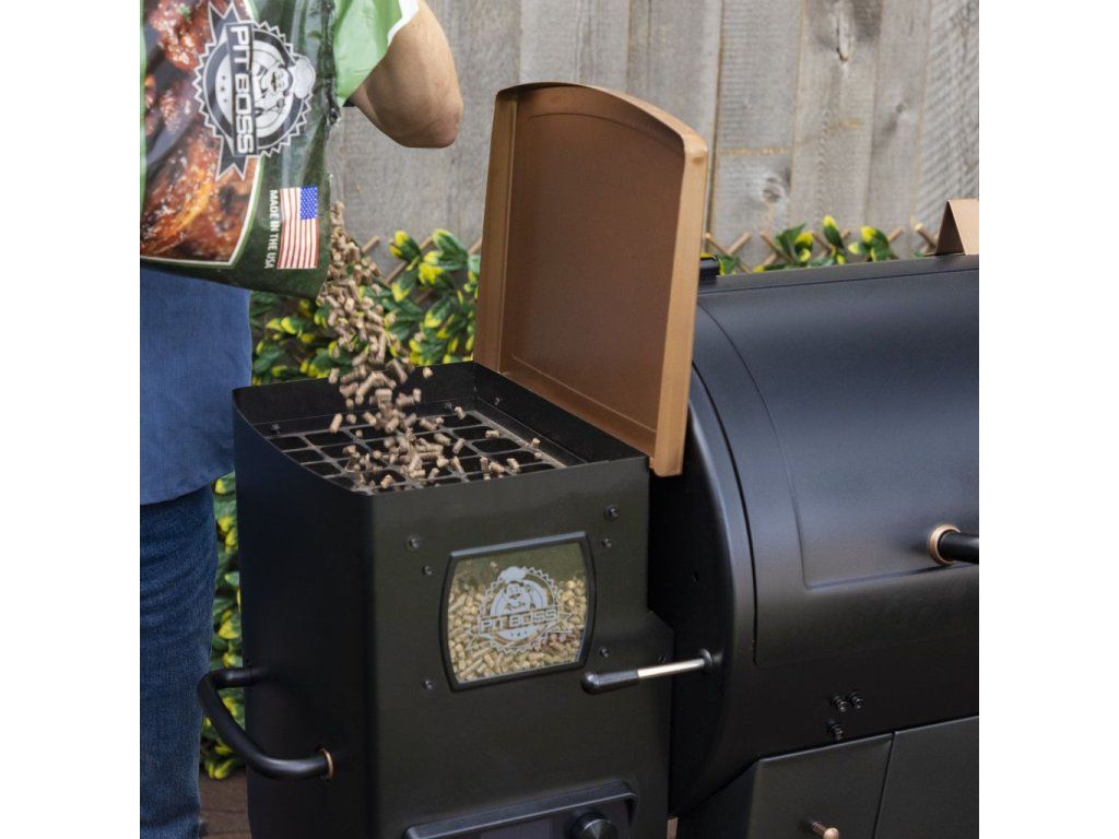 Na levé straně je na grilu osazena násypka (zásobník) na pelety, Jako palivo se používají vždy jednodruhové dřevěné pelety (nebo peletové směsi více dřevin dohromady) určené pro peletové grily. (V žádném případě nepoužívejte jako palivo pelety určené pro topení v peletových kamnech a kotlích.)