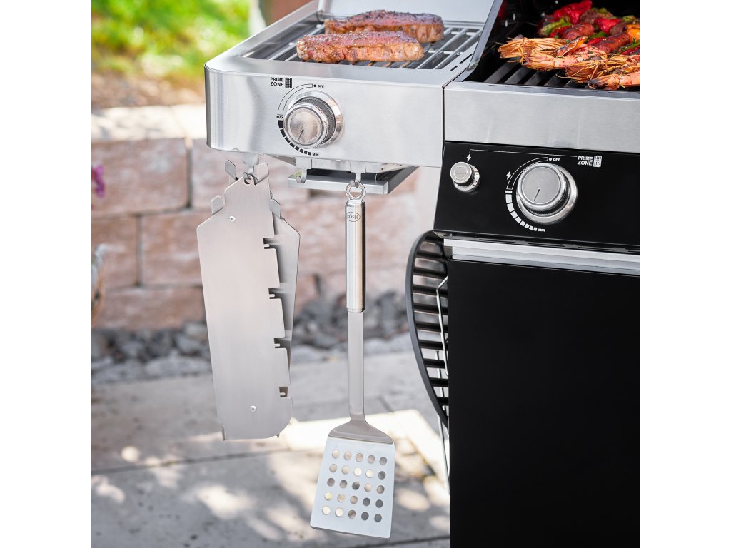 Vestavěný teploměr na grilovacím víku grilu umožňuje neustálý přehled o aktuální teplotě. Nic vám nebude bránit ani v servírování vynikajících pokrmů po setmění – tepelný výkon hořáků lze pohodlně ovládat pomocí podsvícených tlačítek. Plynová láhev má vyhrazeno místo v úložném prostoru pod grilem, kde je skvěle dostupná pro případnou výměnu a nikde nepřekáží. Gril je navíc opatřen velkými kolečky, které zajistí jeho snadné přemístění i na nerovném terénu.