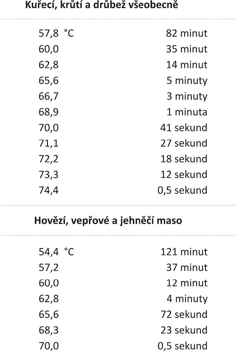 Níže je tabulka vnitřních teplot různých druhů masa, při kterých se maso považuje za bezpečně tepelně upravené. POZOR - nejedná se o teploty preferované ke konzumaci. Každý má rád maso upravené na jiné vnitřní teploty a to už je tedy otázka osobní preference.